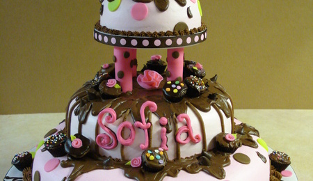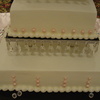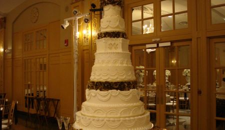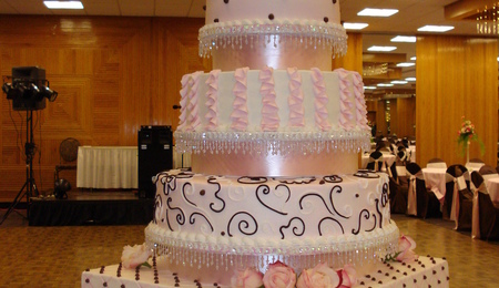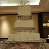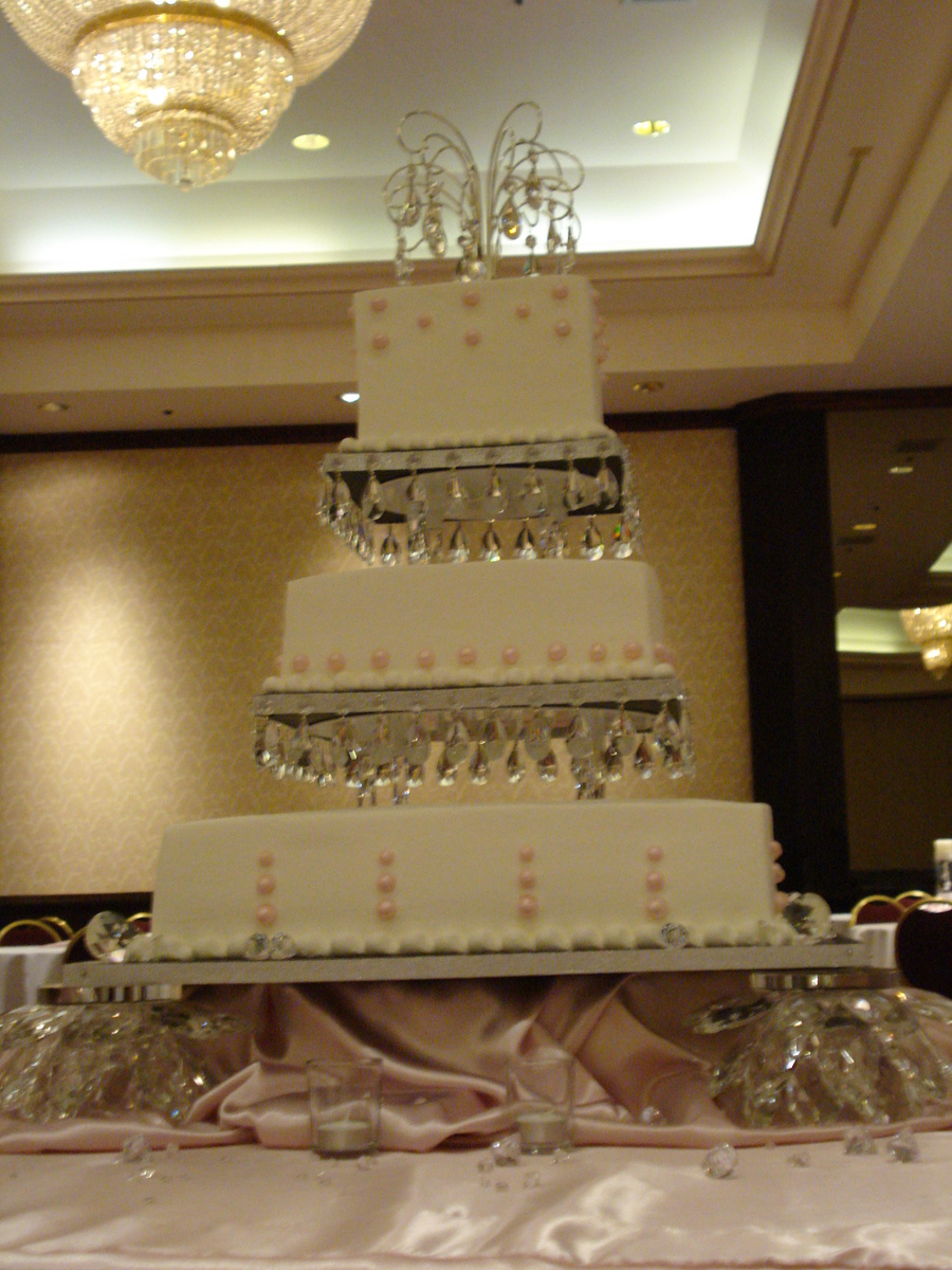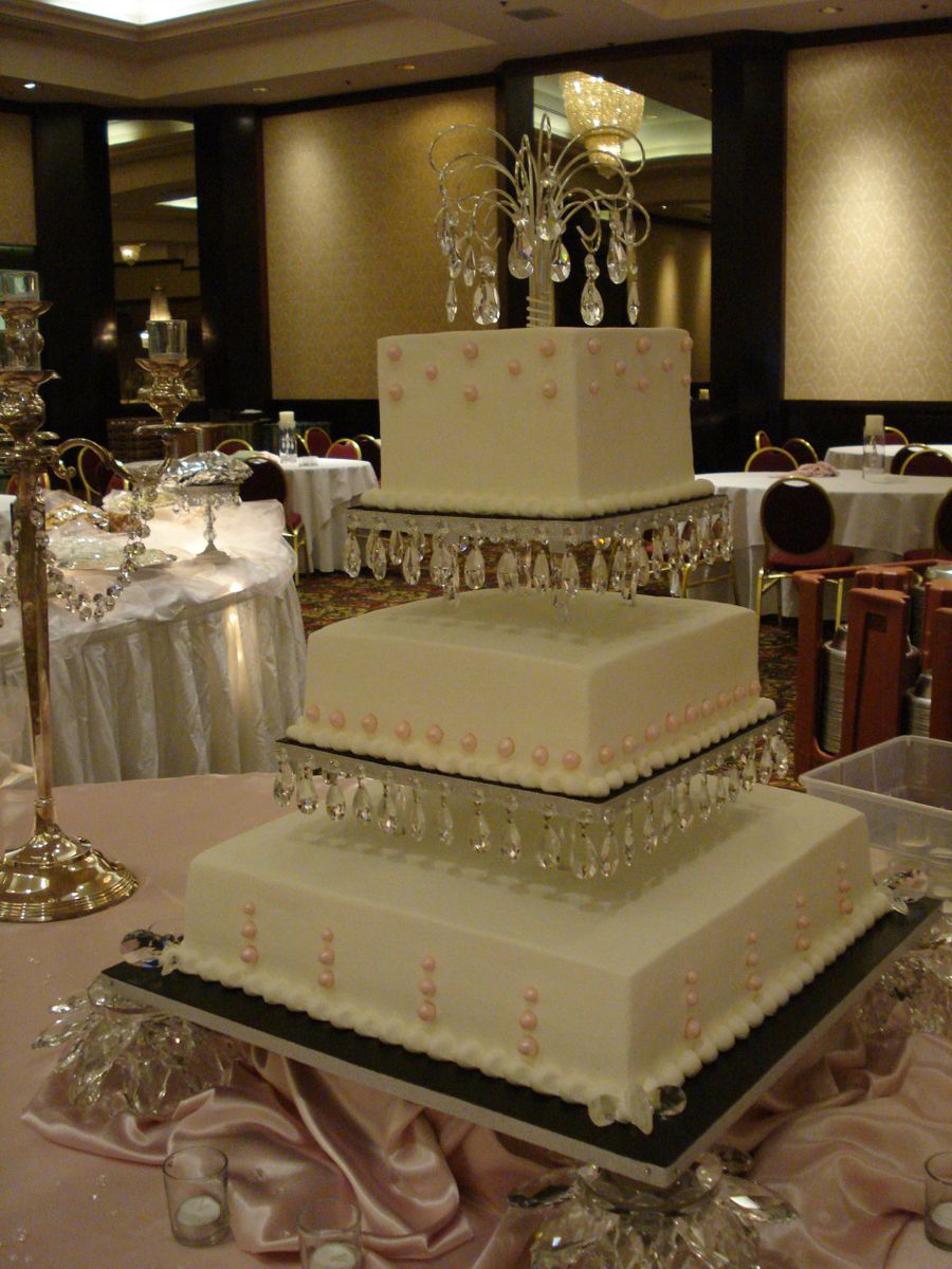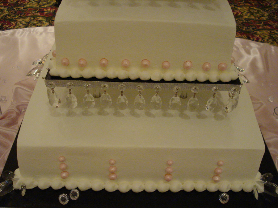 This was a wedding shower for 250 people. Buttercream icing with fondant pearls. Chandelier crystals hanging on cake boards and on top ornament.