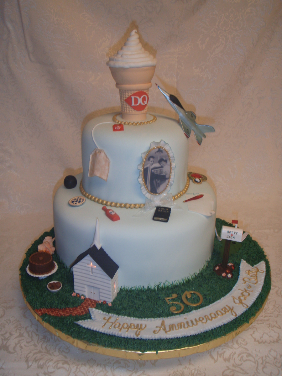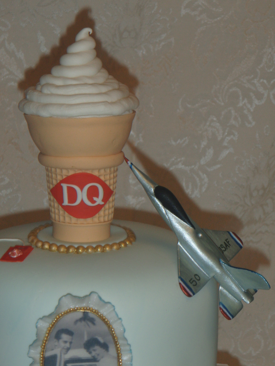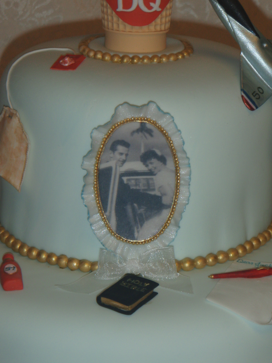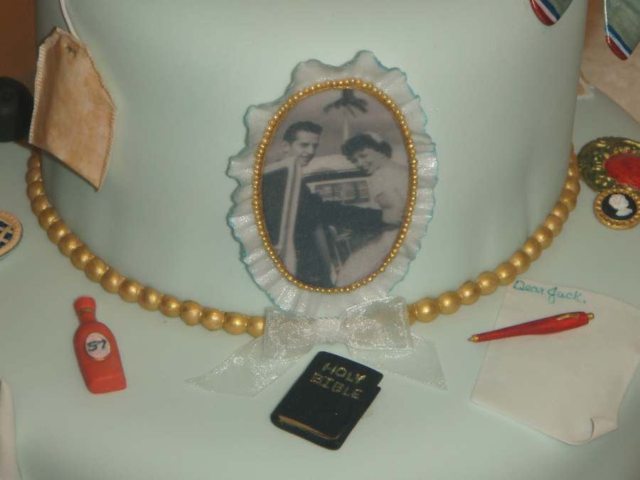 this cake tells the story of jack and betty's life, they met at the dairy queen ( the cone),he was in the air force (the jet),church and God are a main focus to them(the church & bible),she loves to bake pies (the blueberry pie), when he was in the air force she sent him letters every day (the pen, letter,stamps & mailbox) the family joked that she was always walking to the mailbox, she loves peach roses (the roses),he puts ketchup on everything (ketchup bottle),she loves tea (the tea bag), he loves choc. cake and ice cream, and the love to play wii bowling (the ball),and a few other things on the cake too told about the life of jack and betty. it held a lot of wonderful memories for a wonderful family. thanks for looking.
