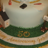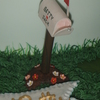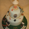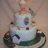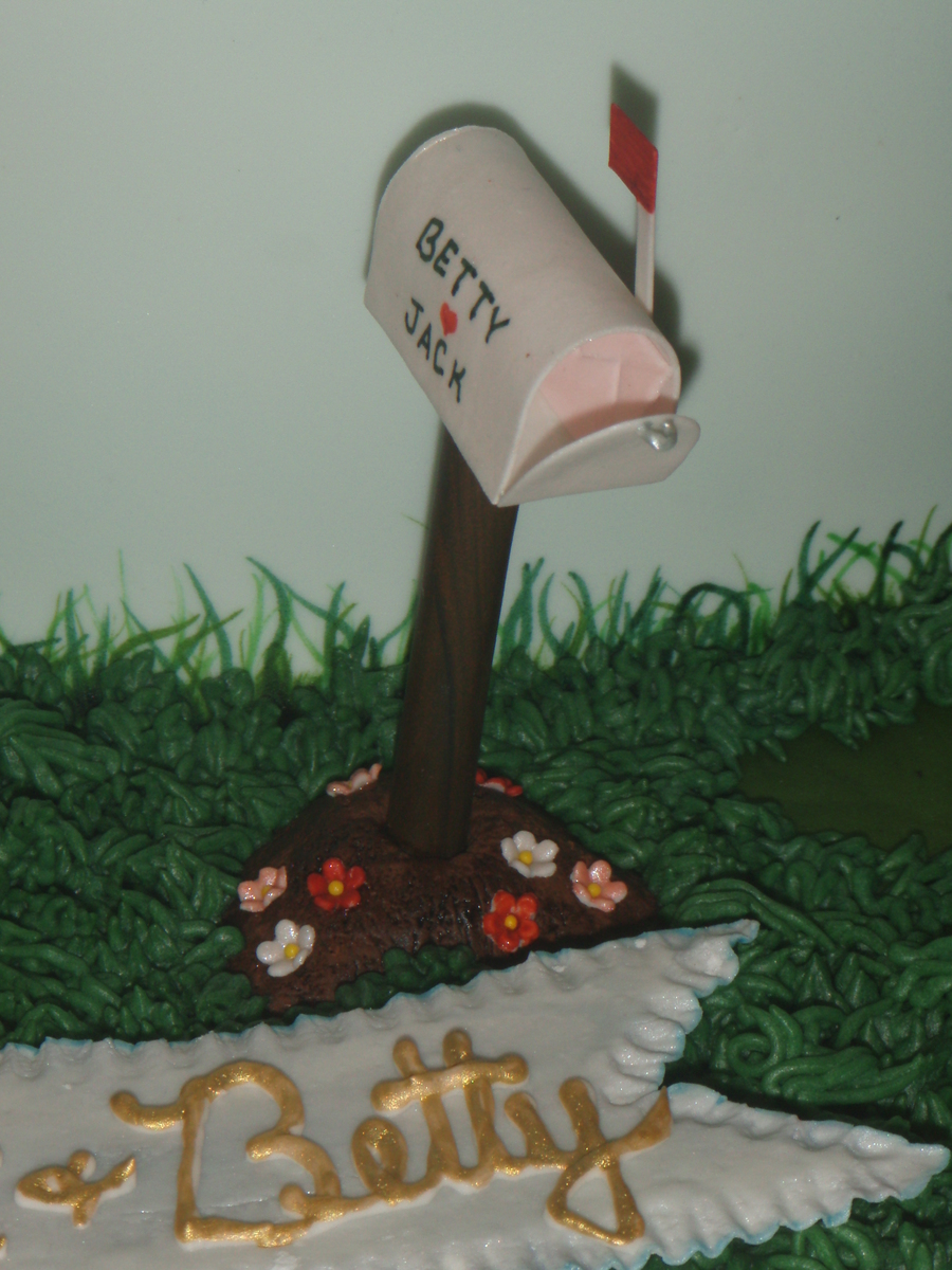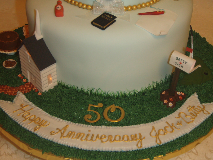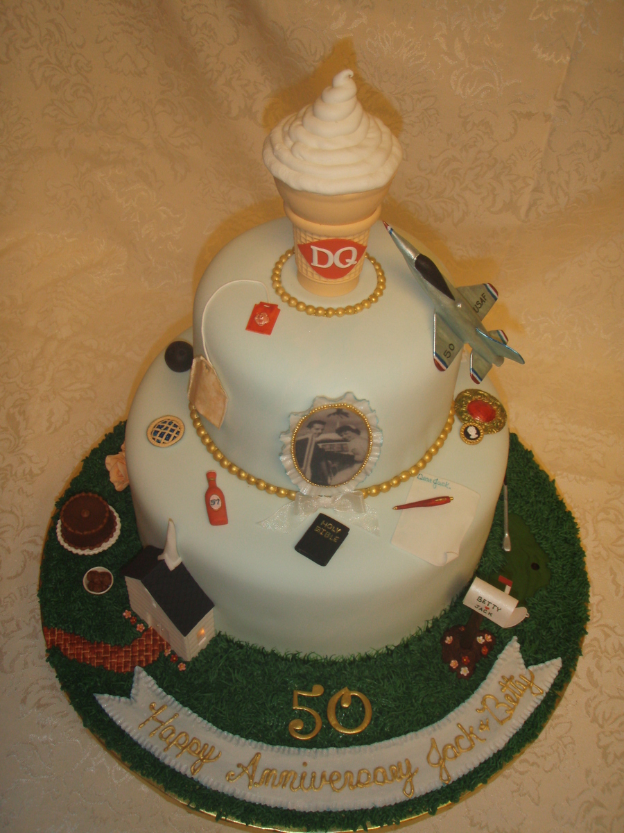 this cake tells the story of jack and betty's life, they met at the dairy queen ( the cone),he was in the air force (the jet),church and God are a main focus to them(the church & bible),she loves to bake pies (the blueberry pie), when he was in the air force she sent him letters every day (the pen, letter,stamps & mailbox) the family joked that she was always walking to the mailbox, she loves peach roses (the roses),he puts ketchup on everything (ketchup bottle),she loves tea (the tea bag), he loves choc. cake and ice cream, and the love to play wii bowling (the ball),and a few other things on the cake too told about the life of jack and betty. it held a lot of wonderful memories for a wonderful family. thanks for looking.