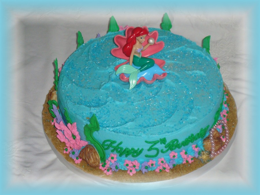 10" buttercream; seashells made out of chocolate; all other decorations made with royal icing. Base covered with brown sugar to imitate sand.