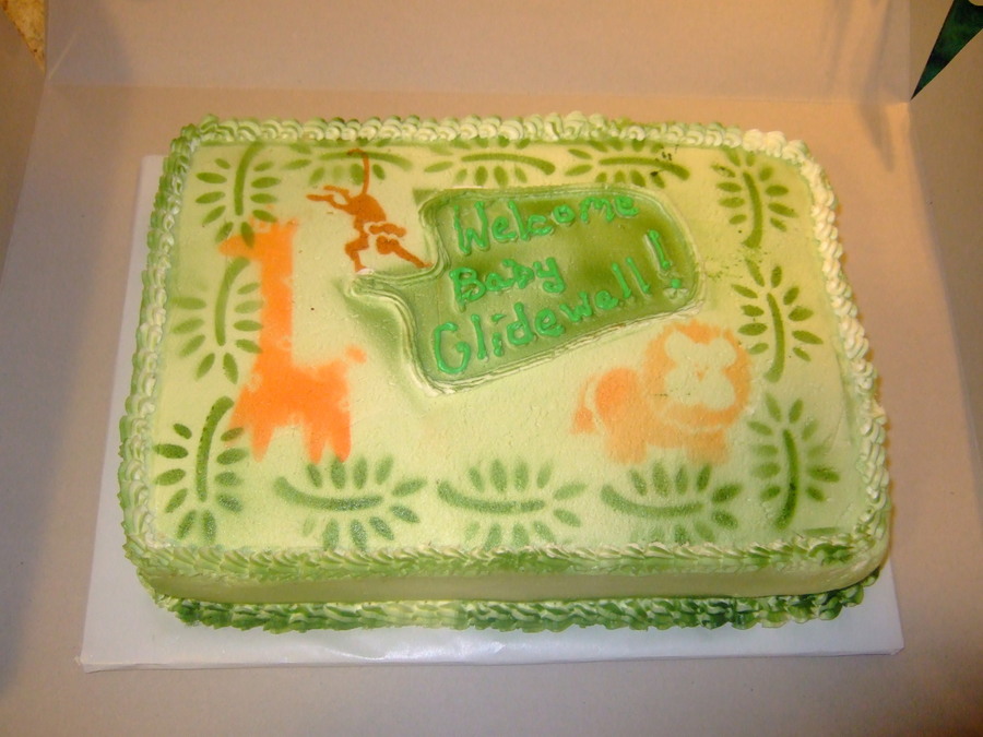 This is a cake for a baby shower. It was my first attempt at airbrushing, I used stencils.