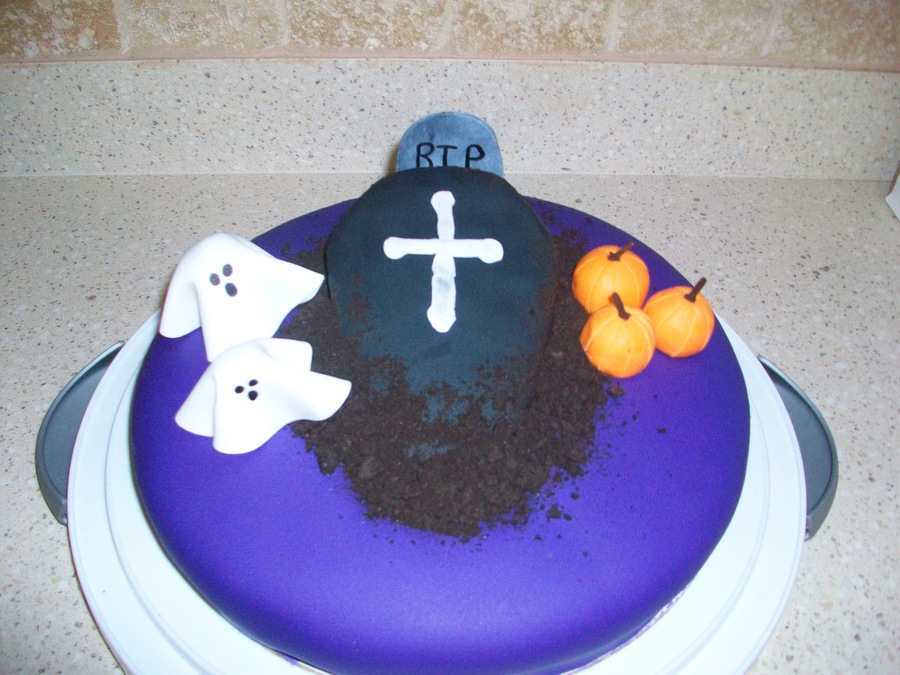 I cut a coffin shape out of the middle, covered both the coffin and the main cake in fondant, then filled the hole with crushed oreos to look like dirt. Pumpkins and ghoast made from gumpaste. Just a fun little cake that I took to a contest at work, and won! :)