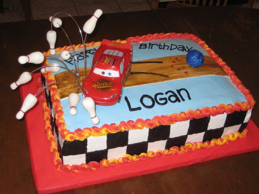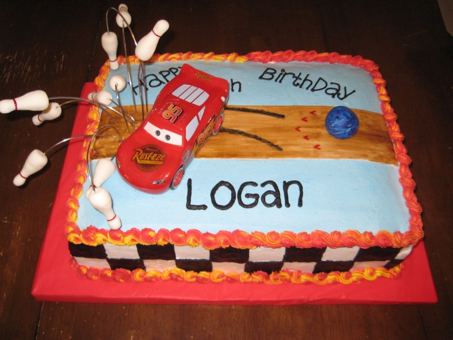 My son's 5th b-day party was at a bowling alley, and he designed the entire cake. He told me what he wanted, and I did my best to create it. LM is a toy car, the pins and ball are fondant, and everything else is BC.