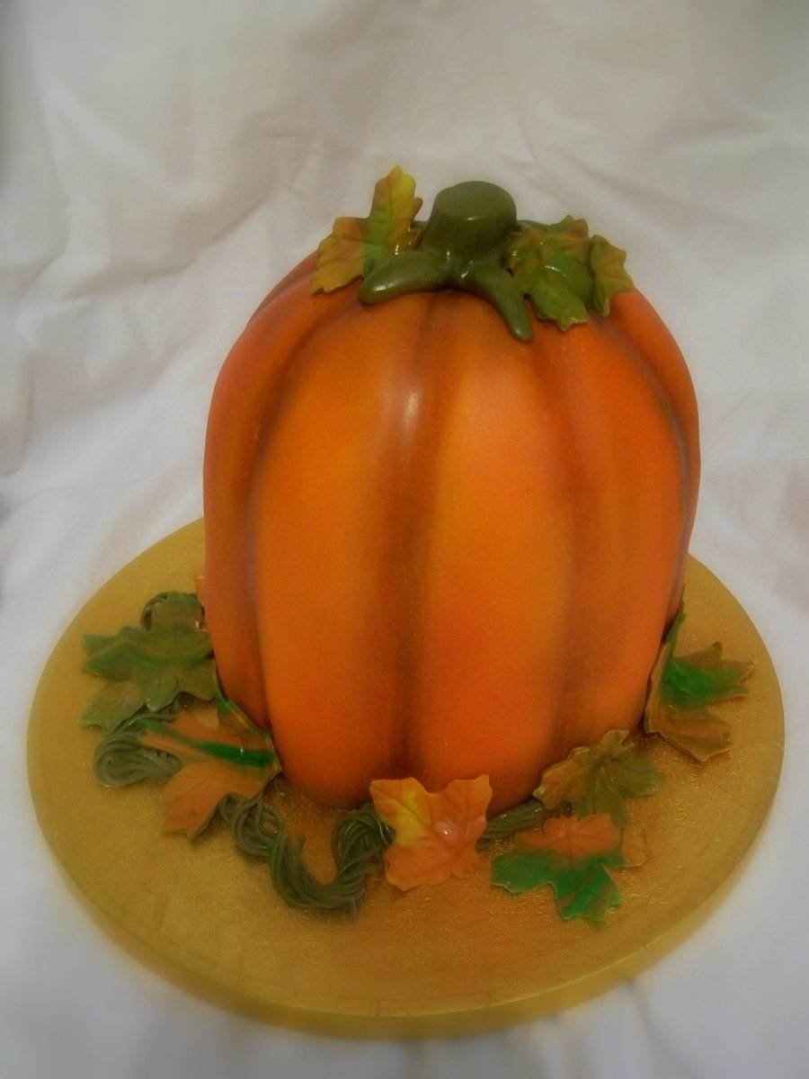 Carved in the shape of a pumpkin and covered in fondant. Airbrushed and added a few leaves and vines.