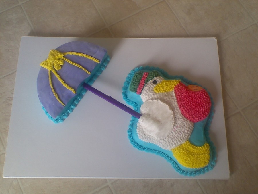 I kinda got in over my head on this cake but it was a lot of fun to do. Everything is edible except the handle for the umbrella. The stork is a white cake with buttercream frosting. The umbrella is chocolate with buttercream and fondant.