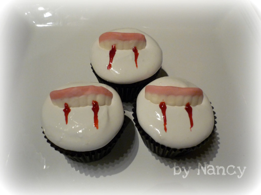 Some vampire cuppies I made for a treat to take to work for Halloween. Chocolate with a caramel centre,marshmellow frosting,gummy teeth/fangs and piping gel blood. Enjoy!