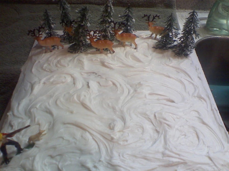 White cake buttercream frosting. Was trying to make it look all snowy but kept having trouble. lol