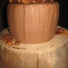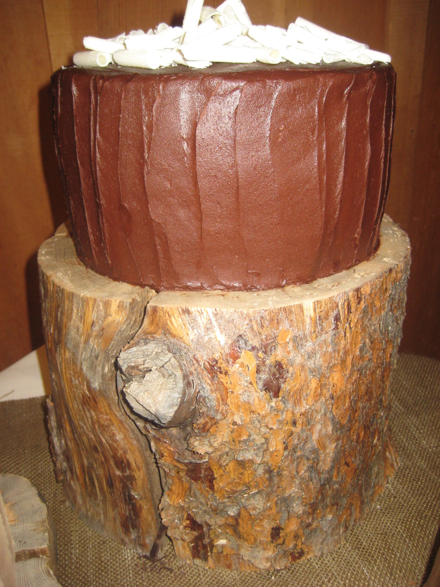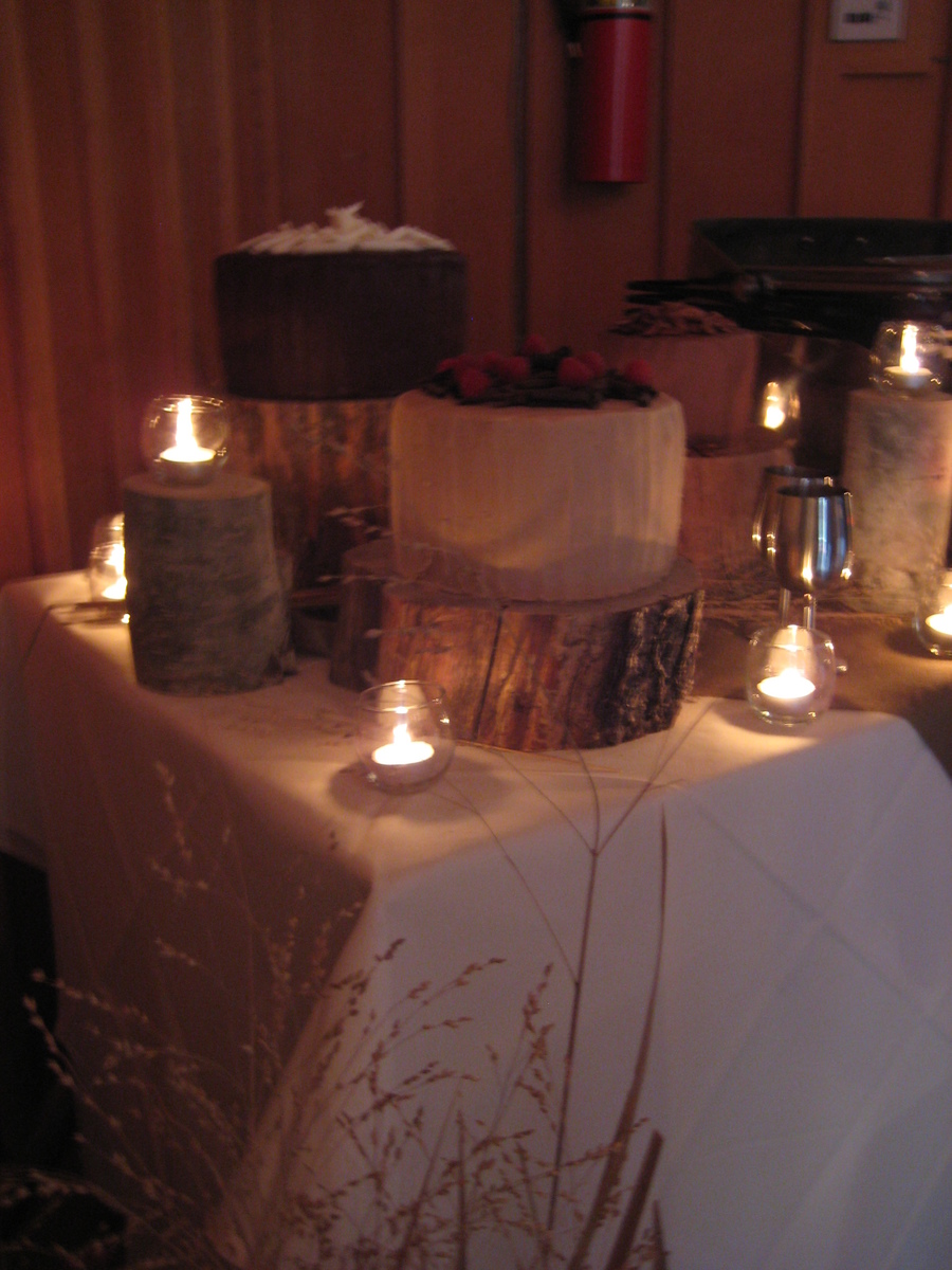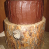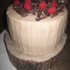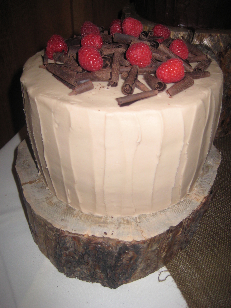 First wedding cake - gift for my BIL and new SIL. Rustic wedding in Sundance. Based off picture she found on some rustic wedding site. Fun, easier cake...most anxiety was remote location with 5 hr drive. Small cake german chocolate, next one white chocolate with truffle filling & layered raspberries and large cake tripple chocolate. All frosted with BC.