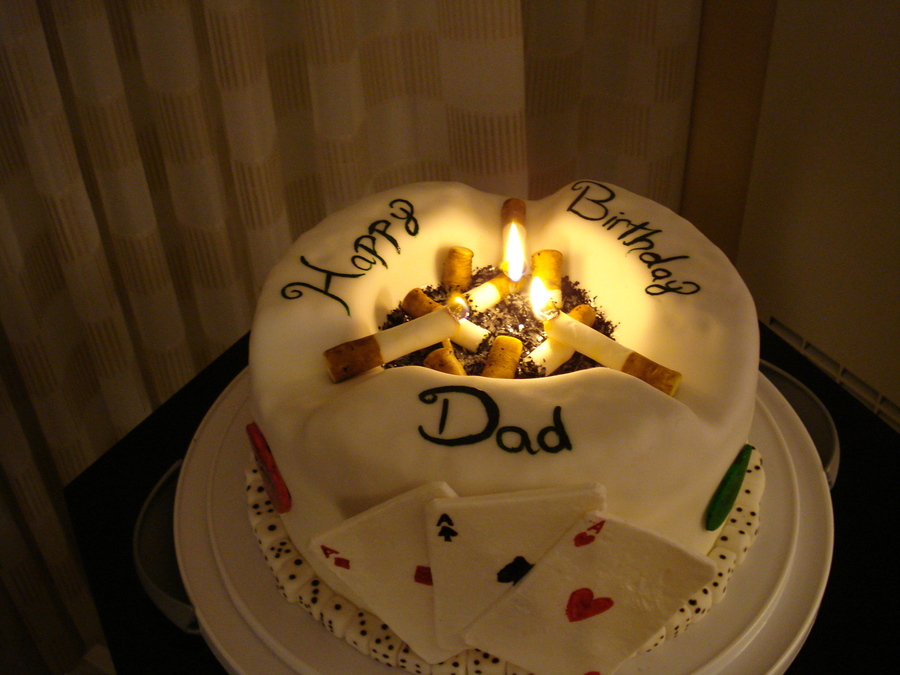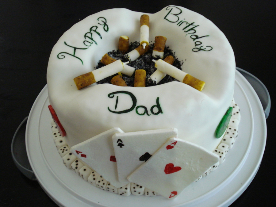 This is a cake i made for my dads 60th birthday. He has been a smoker since i was little and he loves to gamble. Those cigarettes are made of gum paste around candles so they actually burned. Their is also all hand shaped gumpast dice and cards around it.