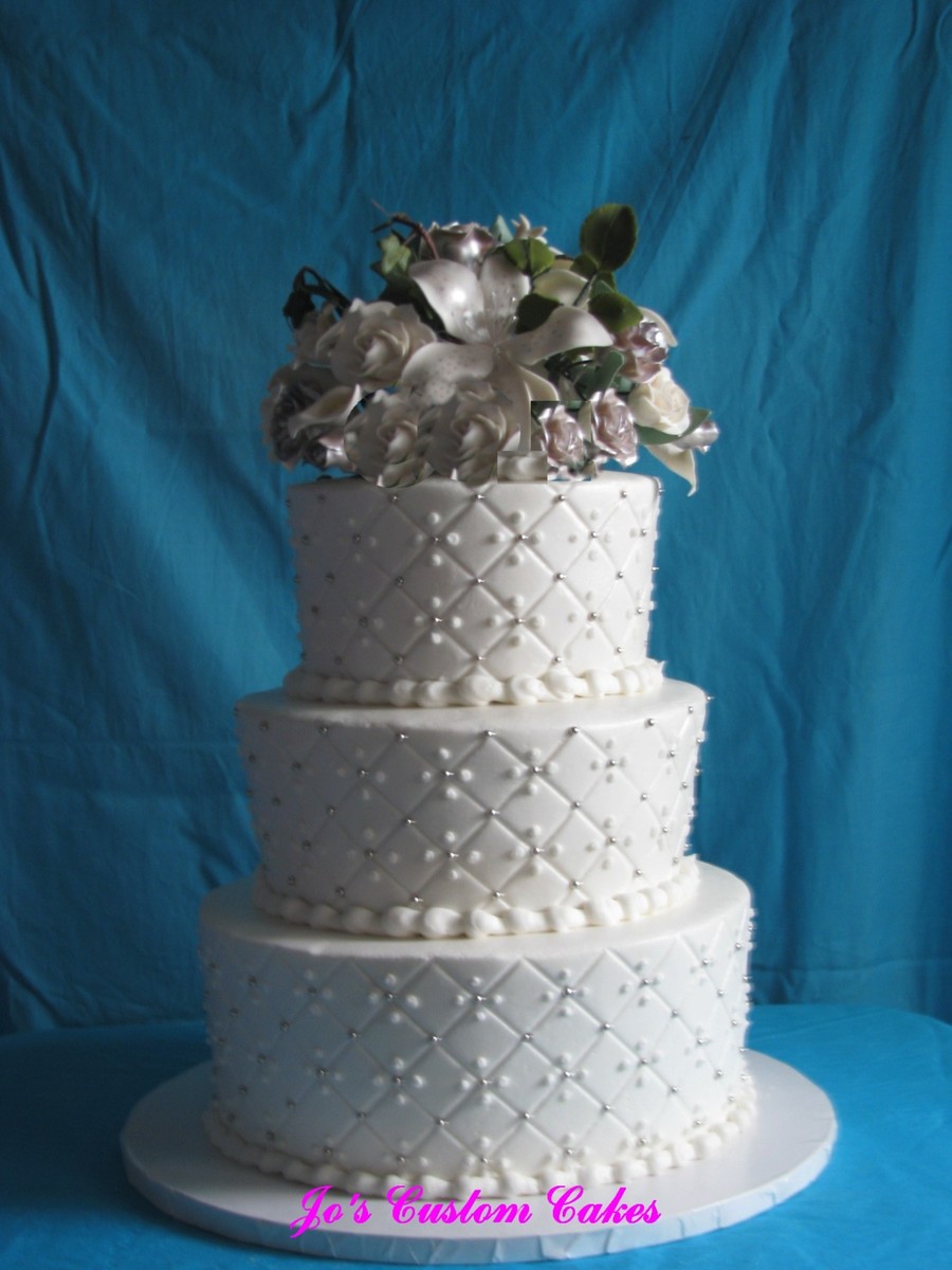 This was for a couples 25th anniversary. It is all buttercream and I used the diamond impression mat and silver dragees. Gumpaste flowers some white, some colored silver
