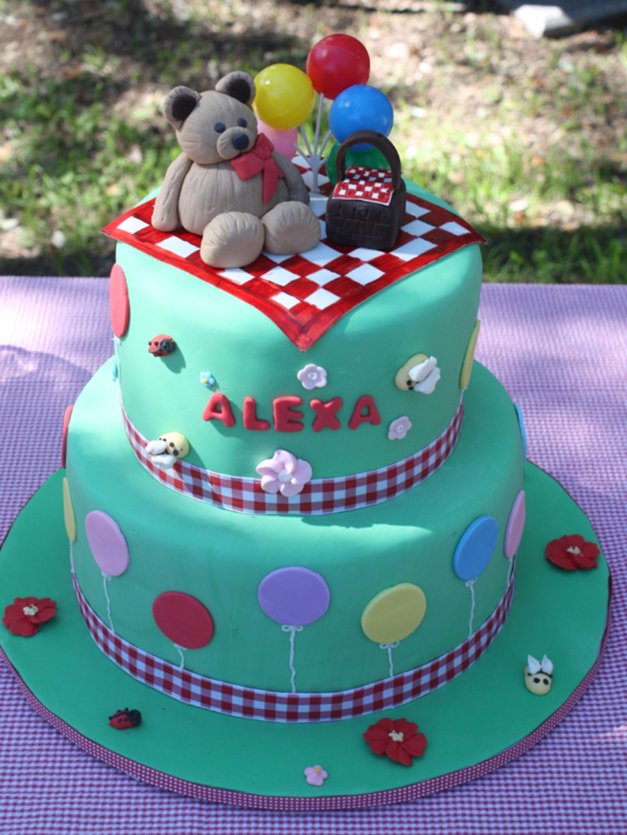10" and 7", fondant over ganache. Everything edible except ribbons and balloons.