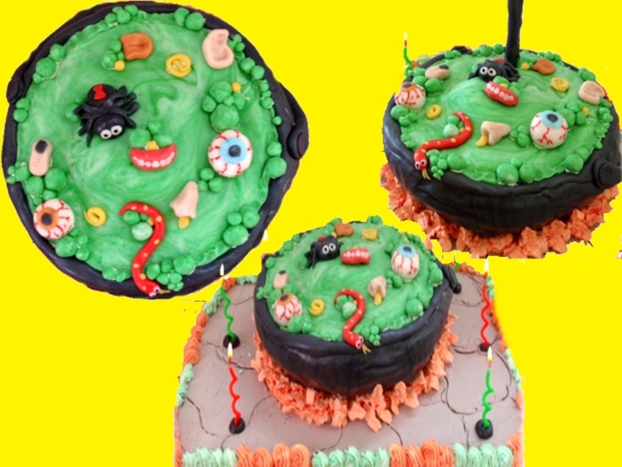 this spooky version of cauldron i made it for a 13 year old girl please note the nose and the other body parts! she wanted a discusting design cake. i hope u like it