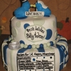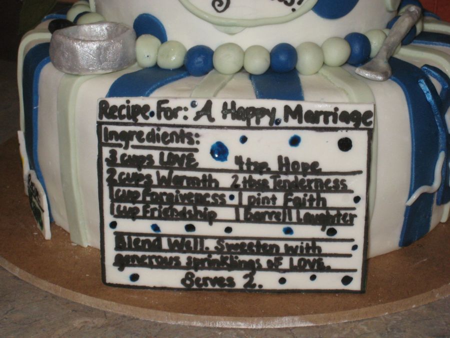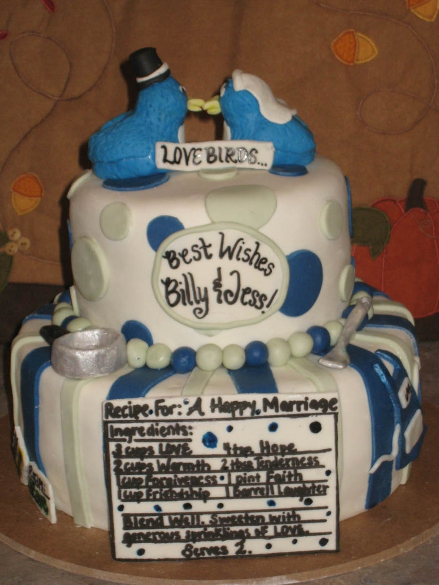 Bridal shower cake for a co-worker. Their invitations had birds on them, so I went with that and the shower we are having at work is a recipe shower so that's why I had the recipe and utensils. The bottom layer is chocolate cake with a butterfinger buttercream and the top layer is yellow with chocolate buttercream.