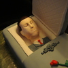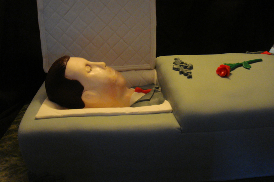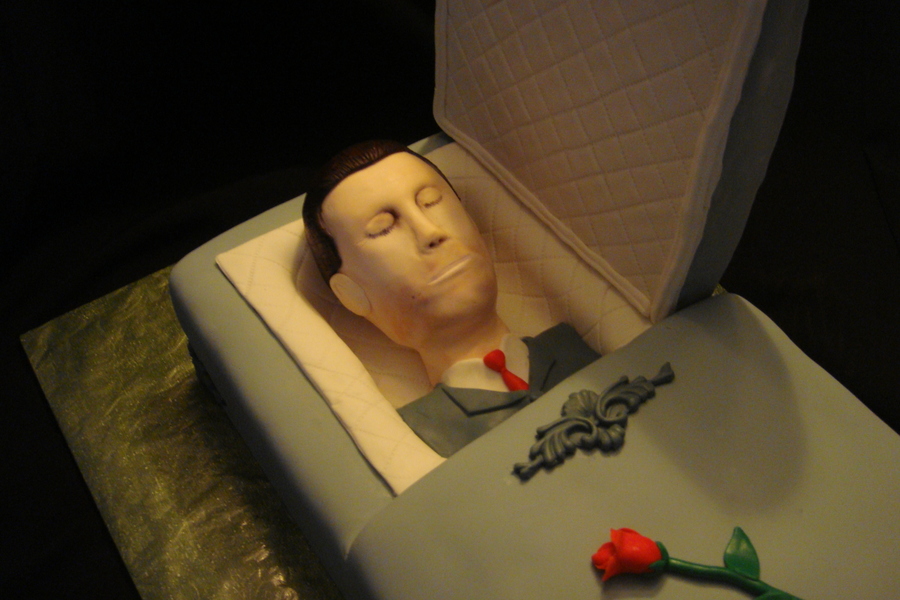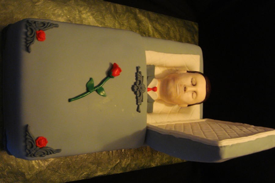 A coffin cake for an unlucky soul who was turning 40 and happened to have Halloween for a birthday. What better way to celebrate than with a wake! The head is rice krispie and fondant, the coffin lid is styrofoam and fondant, and the rest is cake with fondant accents.