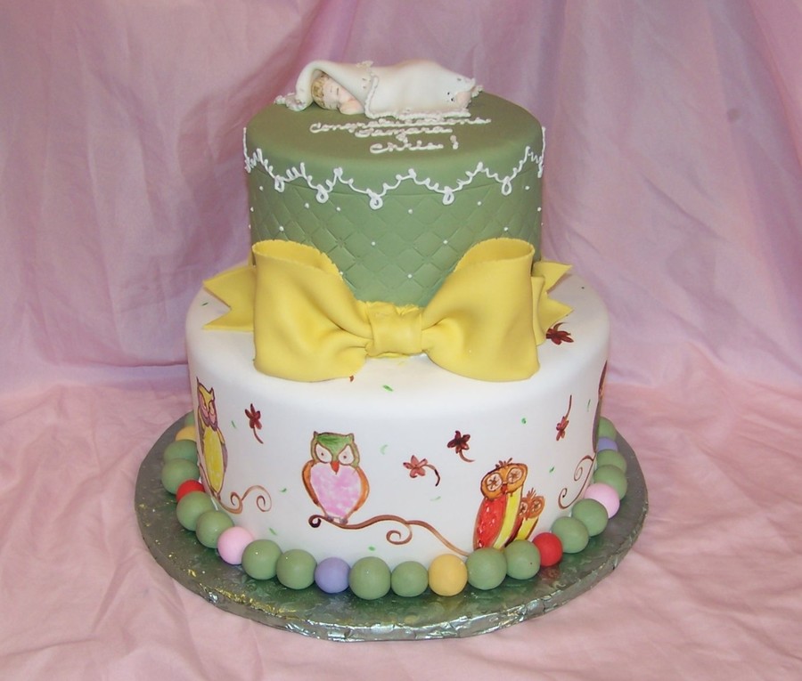 I know this looks different but the bottom tier was made to match a sort of "retro" style blanket the mother-to-be had chosen...the blanket looked somewhat hand-drawn and watercolored so I tried to make it the same effect. I ordered a First Impressions baby mold and it didn't come in time so I just used a generic candy mold I had for the head and made do.
