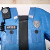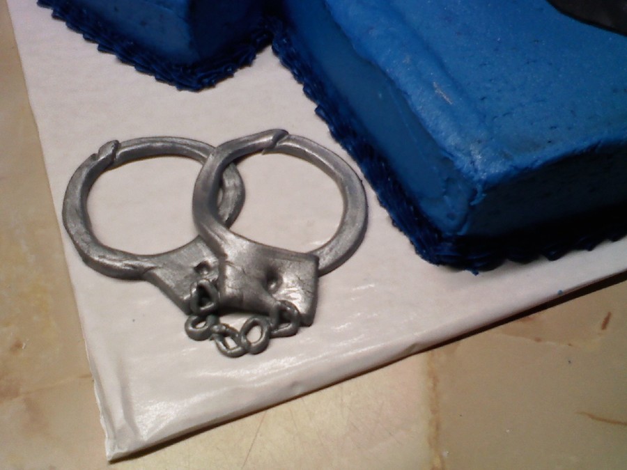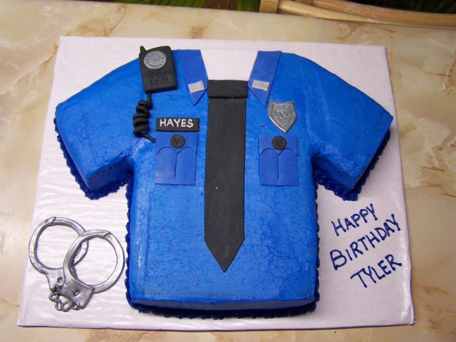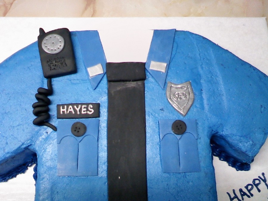 The cake is buttercream. The cuffs, badge, name tag, tie, collar & walkie talkie are made from fondant.
