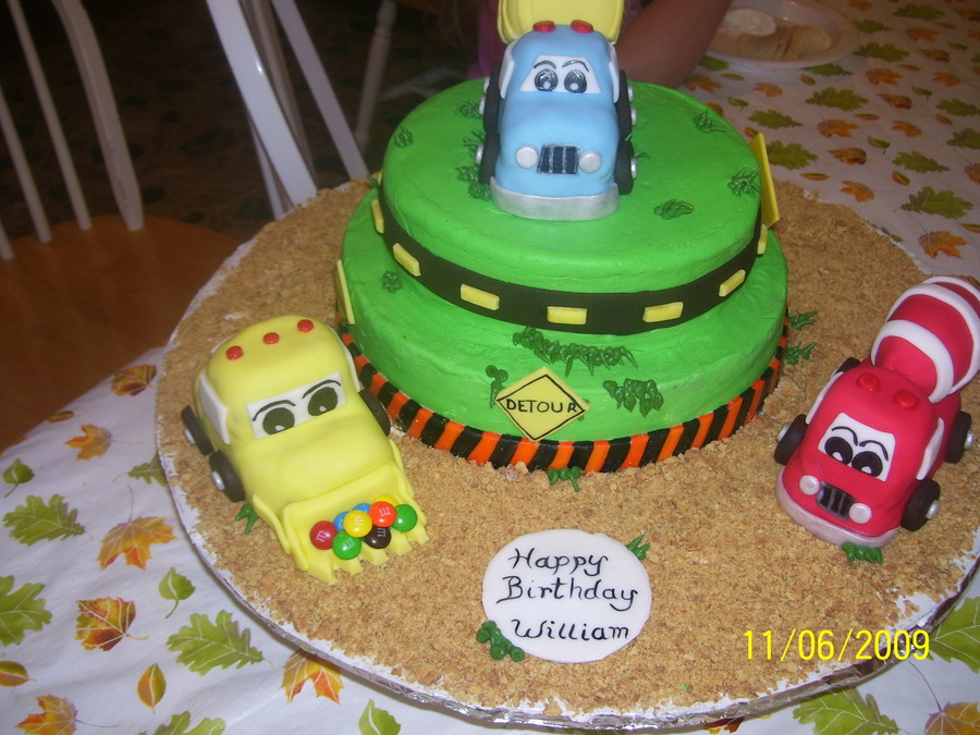 This is a cake that I made for a 2nd birthday. The trucks are made of chocolate RTK with buttercream accents and fondant signs. Graham crackers for the dirt and gravel. First time ever working with RTK. Got the idea from another great cake on CC. Thanks for the ideas and help. TFL