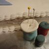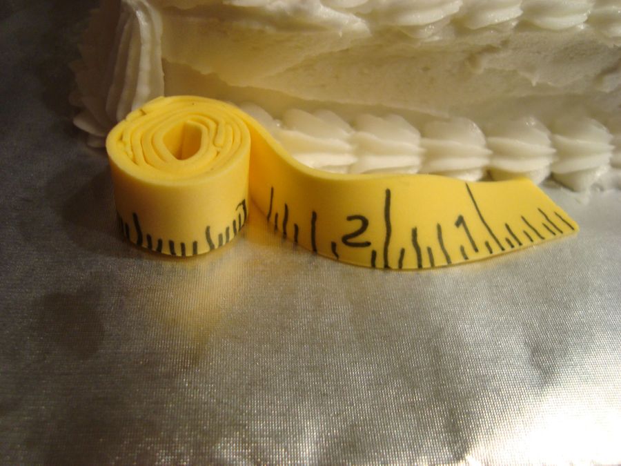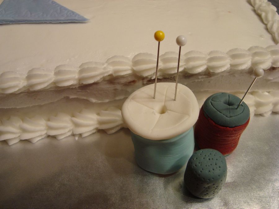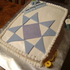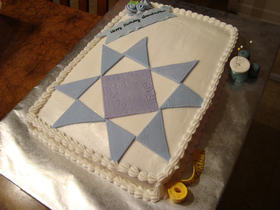 This is a white cake decorated with fondant/gumpaste and buttercream. I found an actual quilt pattern for the main decoration and accented with some sewing notions.