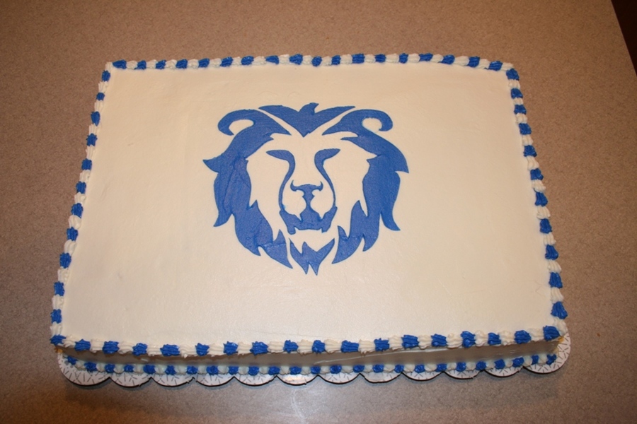 My first attempt at stenciling. I cut the stencil from a plastic sheet using a picture from the web. Cake was for a fundraiser for the sports teams at the school. The school mascot is the Lions.