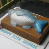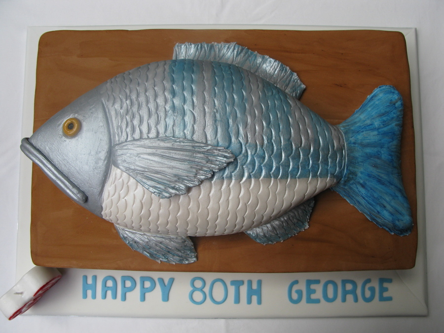 I made this cake for my husband's grandfather's 80th. The fish is from a Collette's Cakes book, and I owe special thanks to LAJUANA for much-appreciated assistance with this cake. I had originally planned to just cover a cakeboard and make it look like wood, but then realised there wouldn't be enough cake for everyone, so decided to do a cake under the fish. It was massive. 14 inches long, 9 inches wide and about 2.5 inches high, so I had to roll the fondant out more than 19 by 14 inches. It was almost the end of me, which is a bit of a worry as I'm just a beginner! The bottom cake is choc mud with dark choc ganache, and the fish is white choc mud with white choc ganache. I hope he likes it!