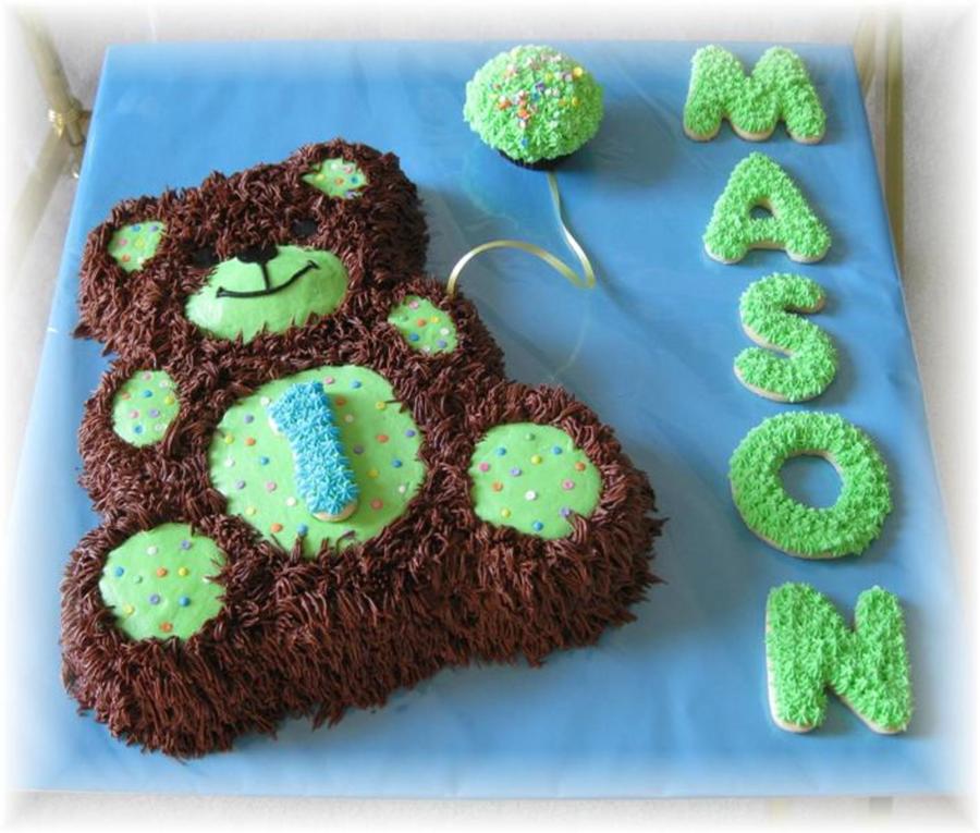 Vanilla cake, white chocolate filling, chocolate buttercream frosting. NFSC for letters and the number, 1. Grass tip to make "fur".
