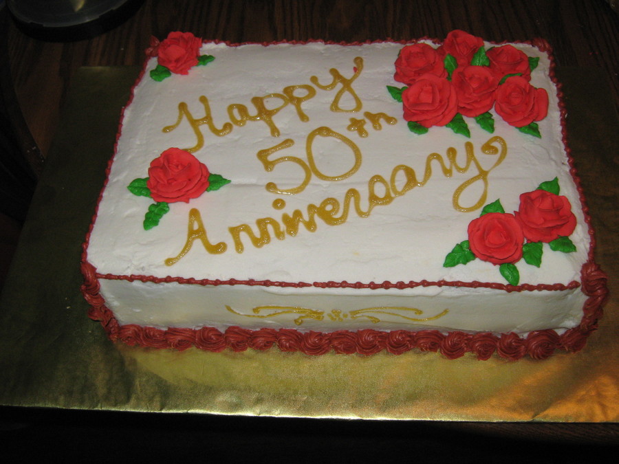 Done for a 50th anniversary party. I do not know how to make gold icing (if anyone knows, please tell me! ) So I just used gold piping gel for the writing and the piping on the sides.