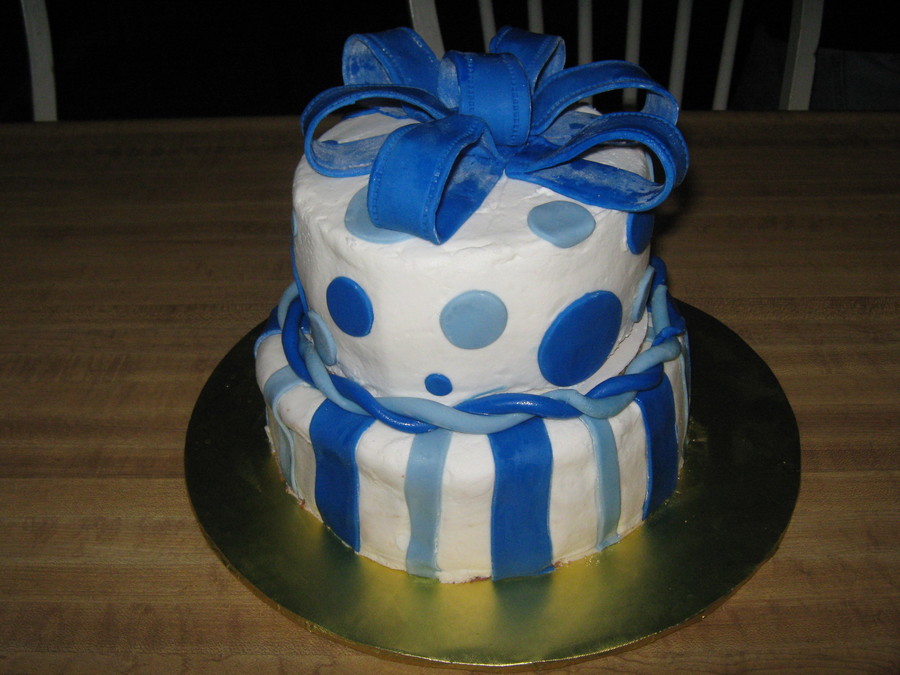 For my nephew's wife's birthday. Her favorite color is blue so I just came up with a blue cake. Top tier is strawberry, bottom tier is chocolate. White buttercream with blue fondant bow and accents.