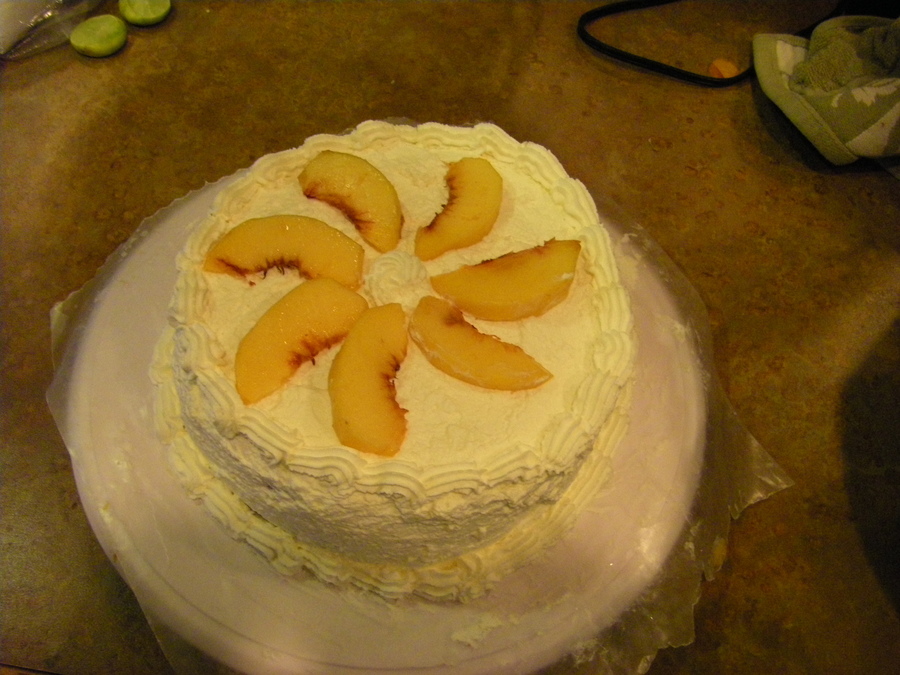Almond Genoise cake with a whipped cream and glazed peach filling. The remaining peaches were used as garnish on top.