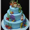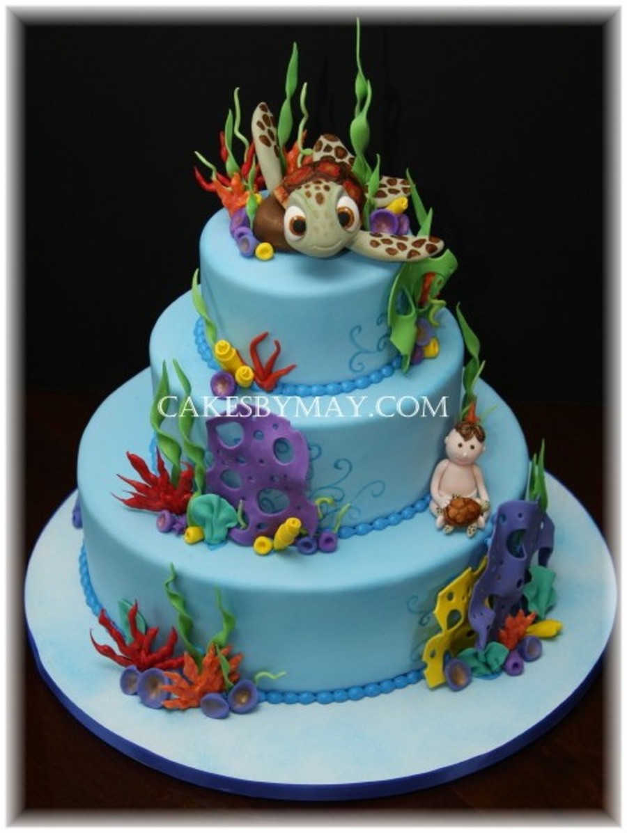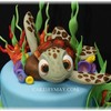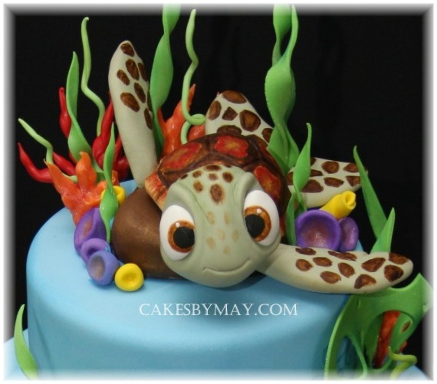 Hand sculpted Squirt's head from a ball of fondant. Turtle shell was handpainted. Also hand sculpted baby holding the turtle. When I finished the turtle I didn't want to give it up! Big cake for 100 guests. TFL!