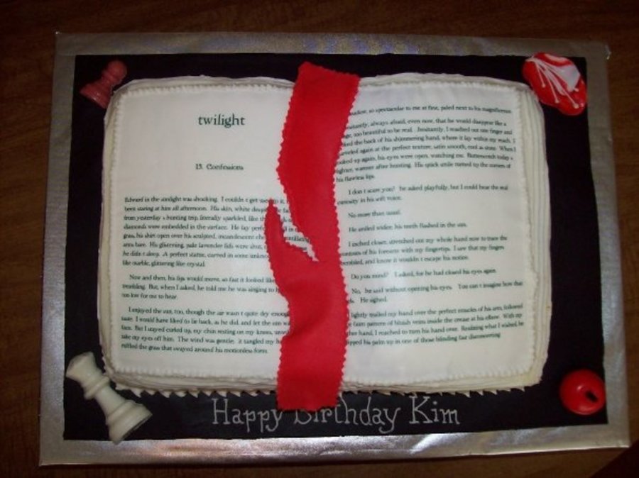 I did this for a friends Bday that used the Twilight theme! Tried to represent all four books for her. The edible image was for the "Dream Chapter" that inspired the movie! I downloaded the Twilight font from Twilights Home Page and tried to replicate it in the Happy Birthday Kim. Lots of fun! Can't wait for the new movie.