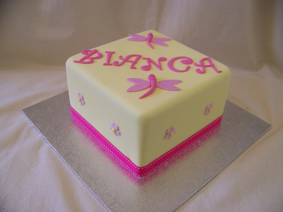 6 inch mud cake covered in lemon yellow fondx with fabric ribbon.