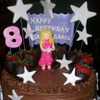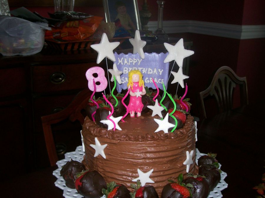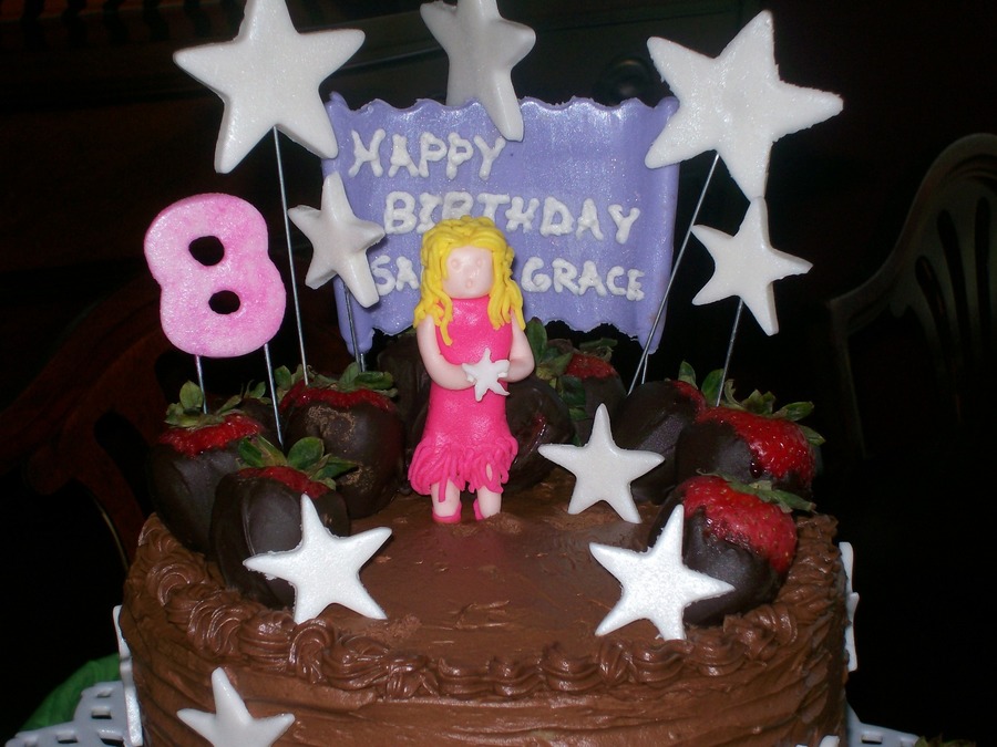 My granddaughter requested a cake with chocolate covered strawberries and chocolate frosting. I made a white cake, with strawberry filling, and chocolate cream cheese frosting. The stars and pop star are fondant, the props are choclate covered strawberries.