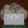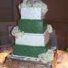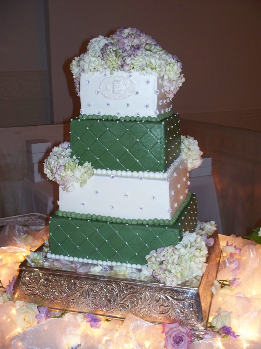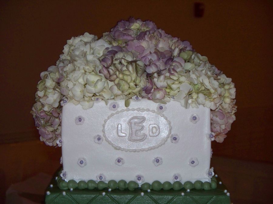 Iced in B/C, 8,10,12,14" tiers, green tiers had diamond impressed print with fondant pearls. White tiers had gum paste flower petals with violet fondant pearl centers. Gum paste initial plaque, and real hydrangeas