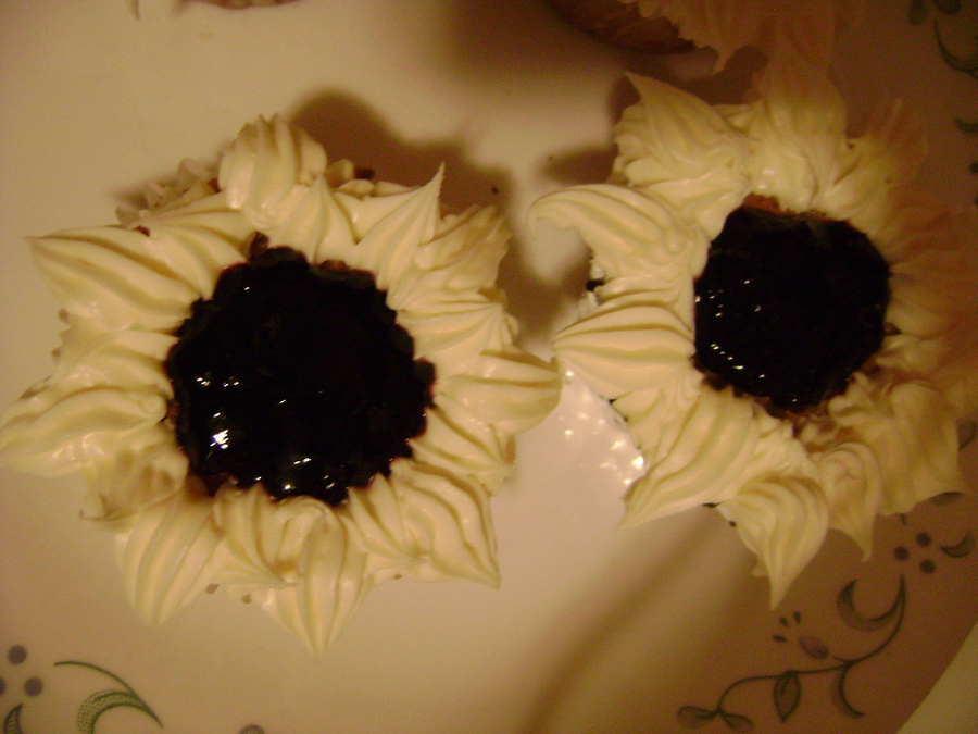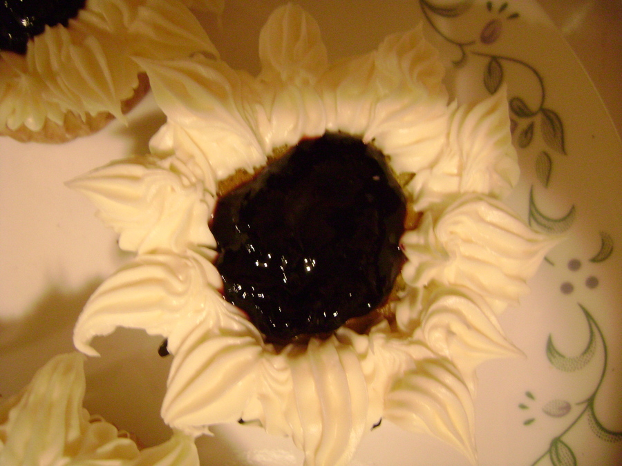 Lemon cake with blackberry jam and cream cheese frosting. I played around making a sun flower with the jam being the center of the flower.