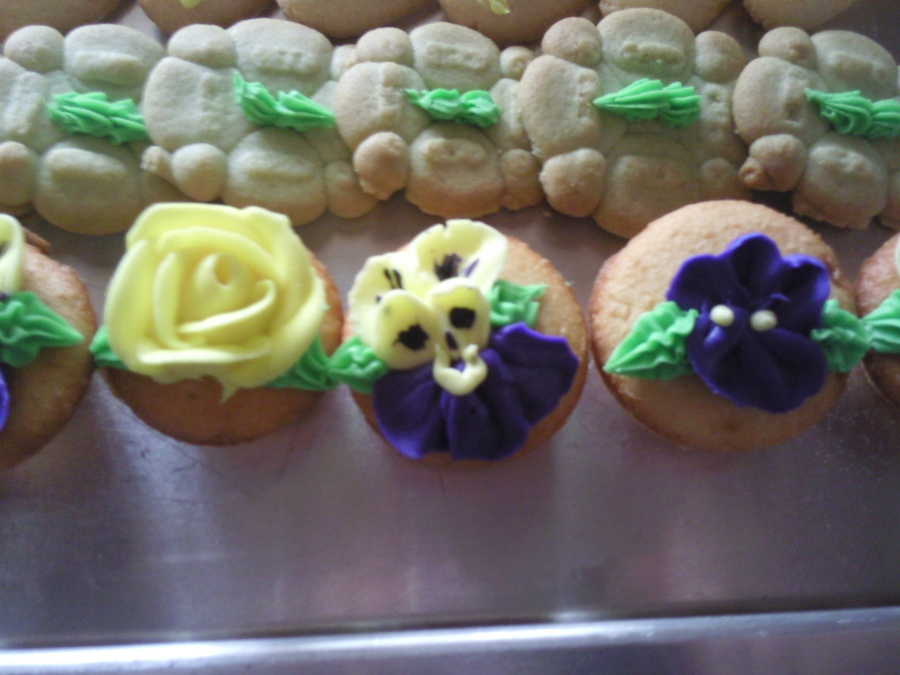 Was asked to do very simple pansies, roses, and sweet peas for a Springtime Bridal Shower. These are mini-cupcakes, piping is done with homemade buttercream stiff consistencey frosting. Detail painted on with gel food coloring