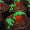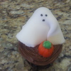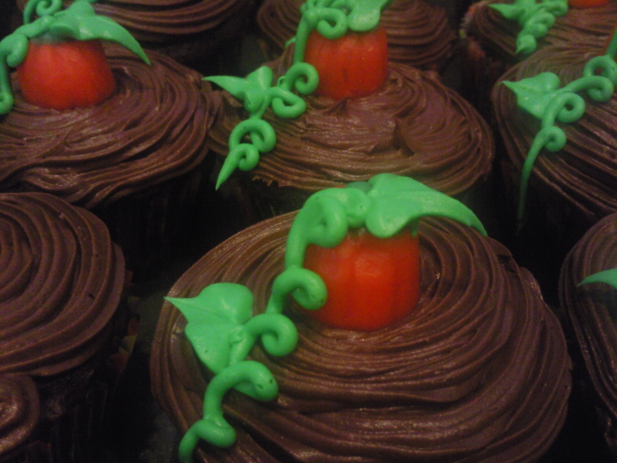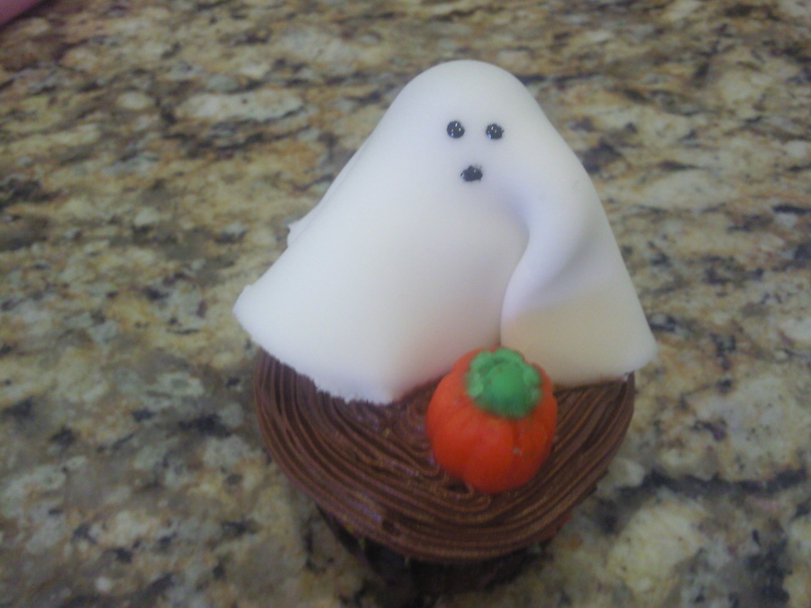 Devil's food cupcakes with MMF ghost toppers and mallow pumpkins. For a large Halloween Party.