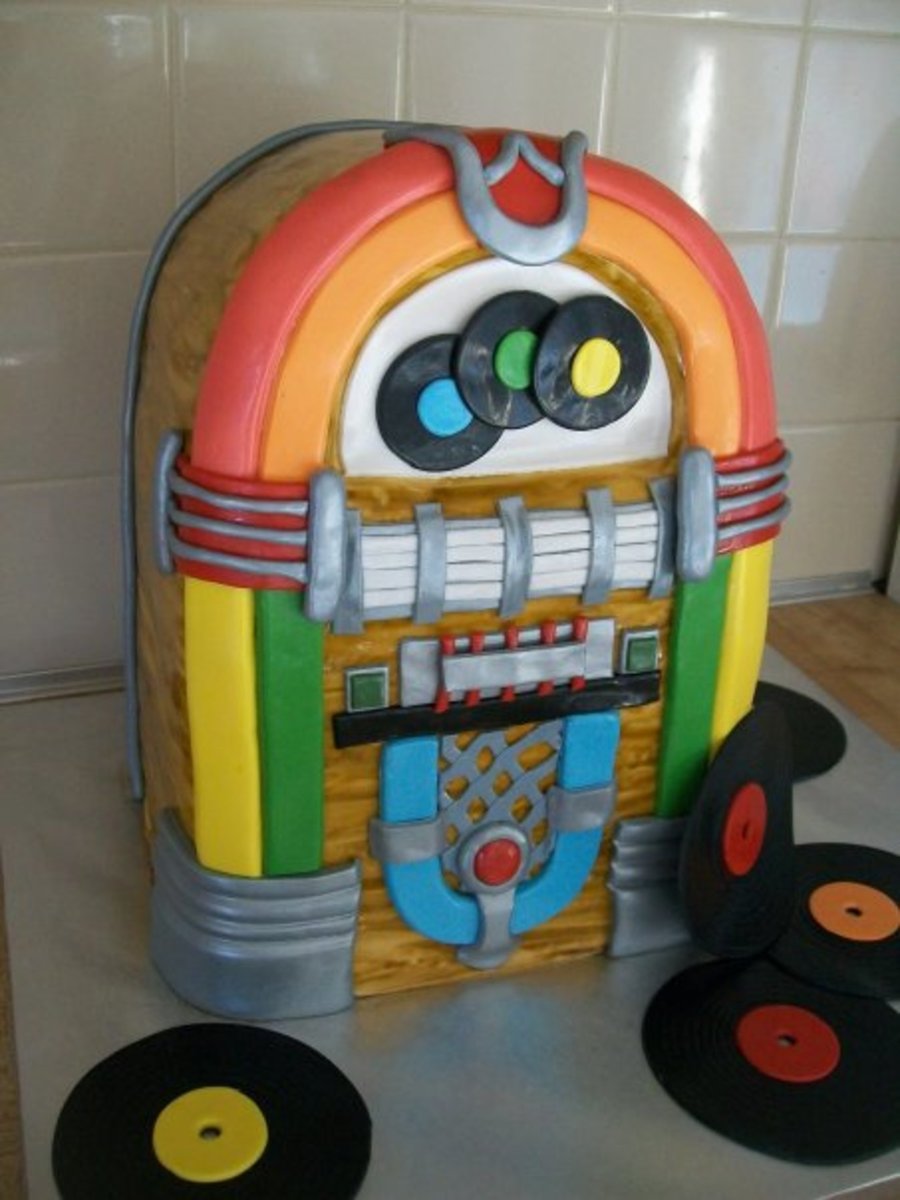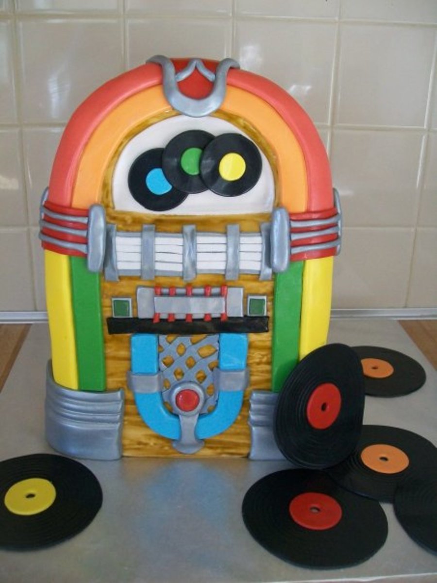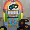 This one was soooo much fun to do! Of course there are things I would do different with the next one...that seems to be how it goes with the first, yu kinda experiment and then the next ones just get even better! i started out with 3 9x13. Cut in half. stacked. Semi-froze, carved with an electric knife ( cake flying everywhere...lol). Decorated! Like I said...sooo much fun. I would of loved to put sng titles on the tabs and records...thought of that too late. The customer LOVED it! TFL :)