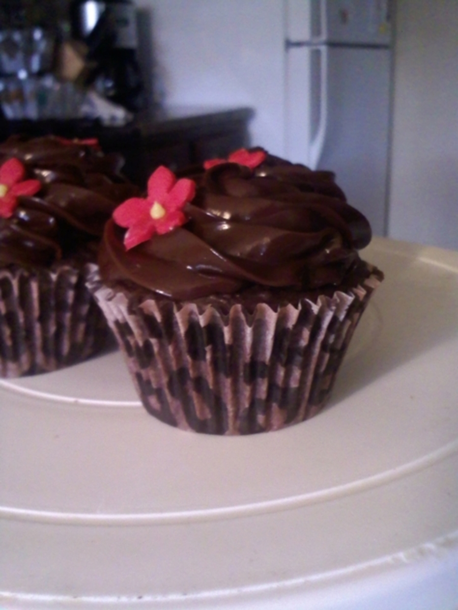 9 inch round buttercream cake w/ fondant/gumpaste decorations, and matching cupcakes. Everything is edible. Cupcake liners are leopard print.