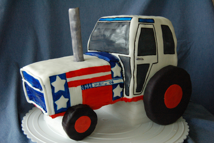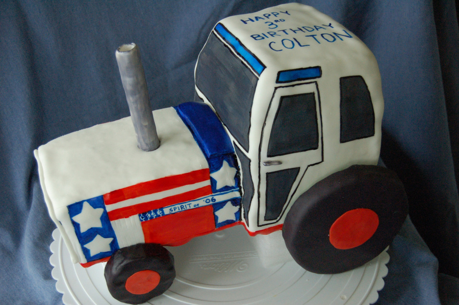 Made for my son's 3rd birthday, which is June 30th. We celebrated his birthday on the 4th of July and this cake fit the theme perfectly. Case IH actually put this tractor out back in 1976, it was called the Spirit of '76. I made Colton's tractor to say Spirit of '03, the year he was born. Cake stacked up and carved, iced in buttercream, then covered in fondant and finally painted. I wish I had allowed myself more time to get some more details on the cake, but he loved it anyway.