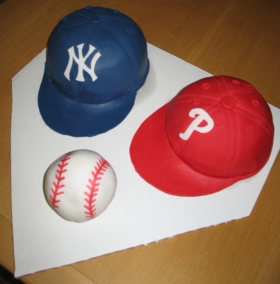 Cakes to celebrate the World Series! I've been looking for an excuse to make hats so I did these for practice for friends that came over to watch the final game. I baked the hats in a small Pyrex bowl, ball is carved from a large cupcake. Lessons learned: try better to make the ball less lumpy and next time make a template for the hat brim! All covered and detailed with fondant.