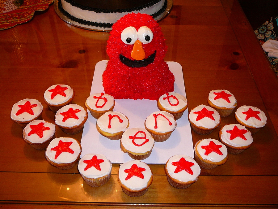 This is the wilton bear pan, decorated like elmo. Cupcakes are regular size all buttercream