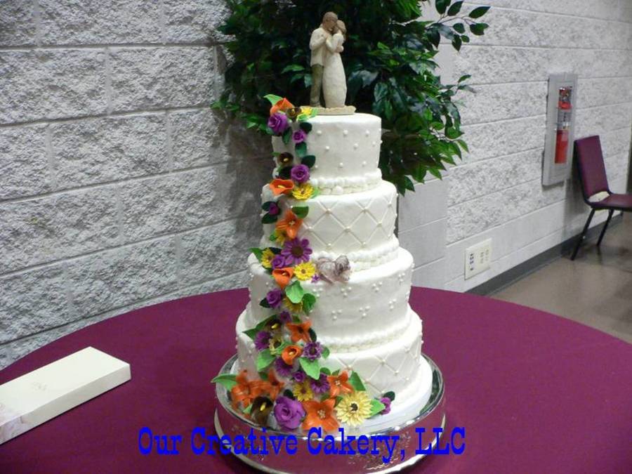 Buttercream cake with gumpaste flowers, and a small dog on middle tier.