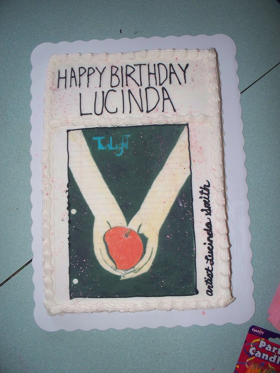 The picture on the cake was hand drawn by my daughter on notebook paper (note the lines and holes) and I transferred it to the cake. The cake was chocolate with buttercream filling.
