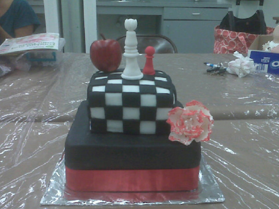 Chocolate cake covered in fondant. Fondant decorations, chess pieces. Apple was made of wood, didnt have time to make that in fondant.