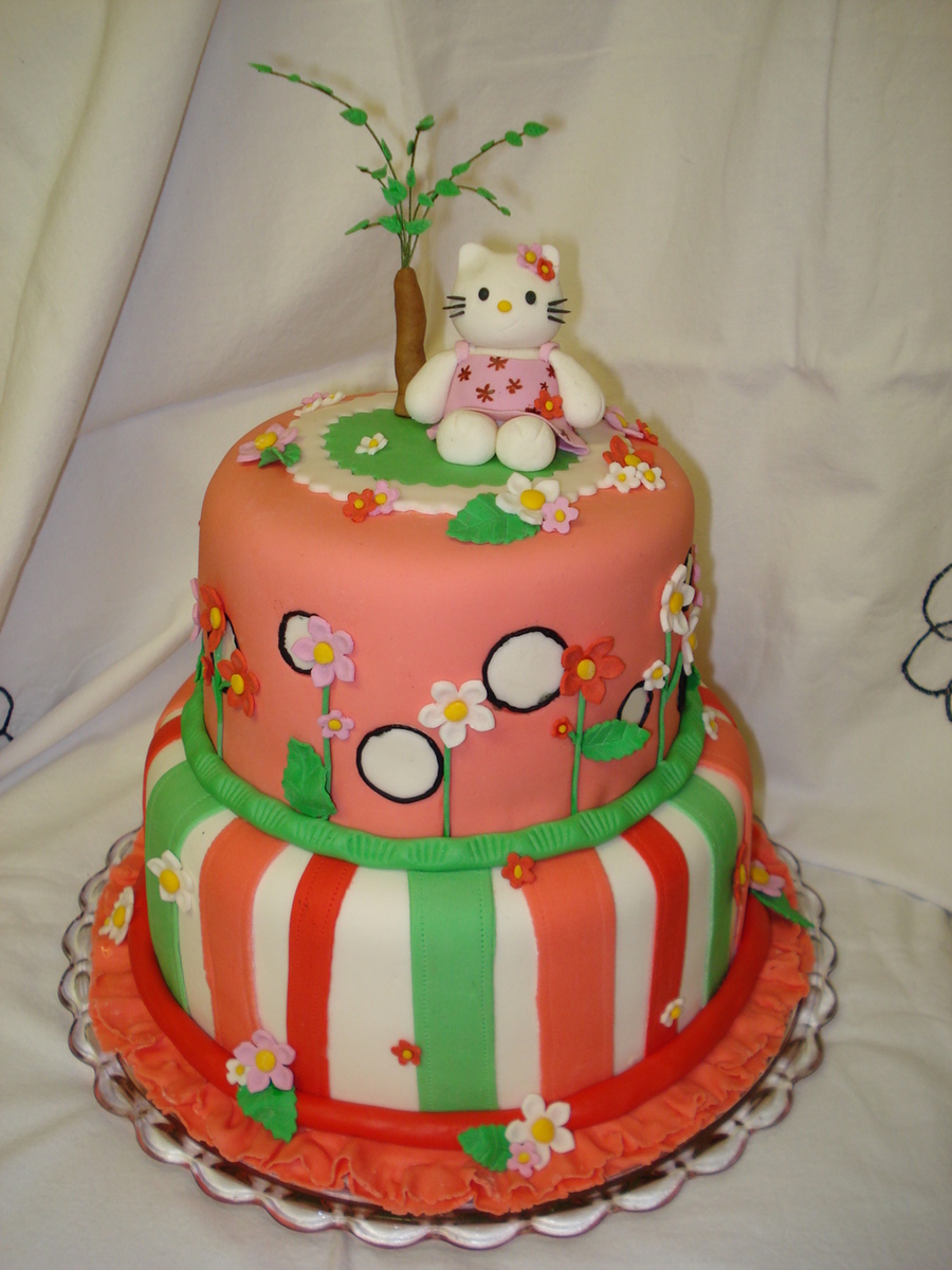 Made for my neice's birthday. Fondant covered cake with gumpaste flower, kitty, and tree.