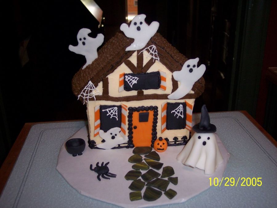 The cake is a vanilla pound cake that was made from scratch with buttercream icing and fondant was used for the ghosts, shutters, and other decor.