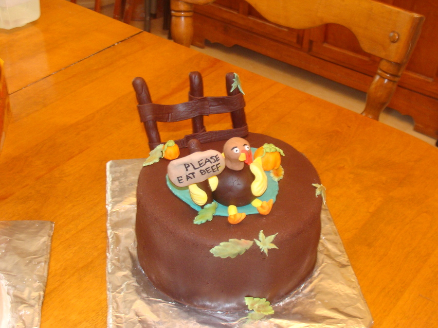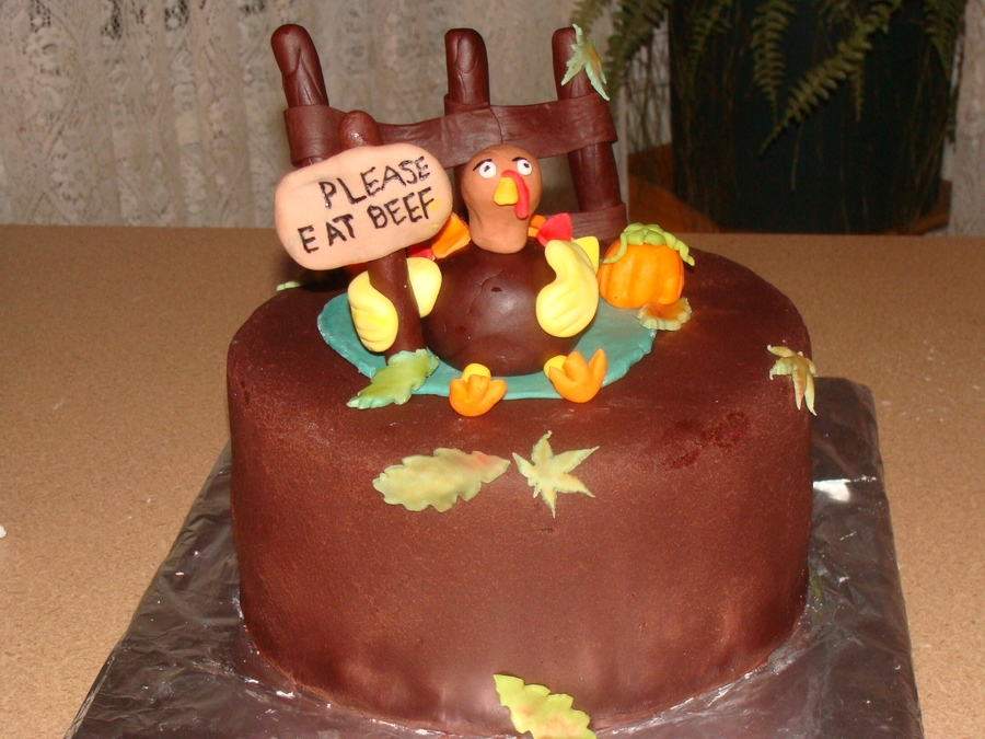 cake I made for thanksgiving. It is choc with raspberry filling and choc fondant. Another attempt at sculpted figures. Designed after a few cakes i saw here on CC.