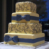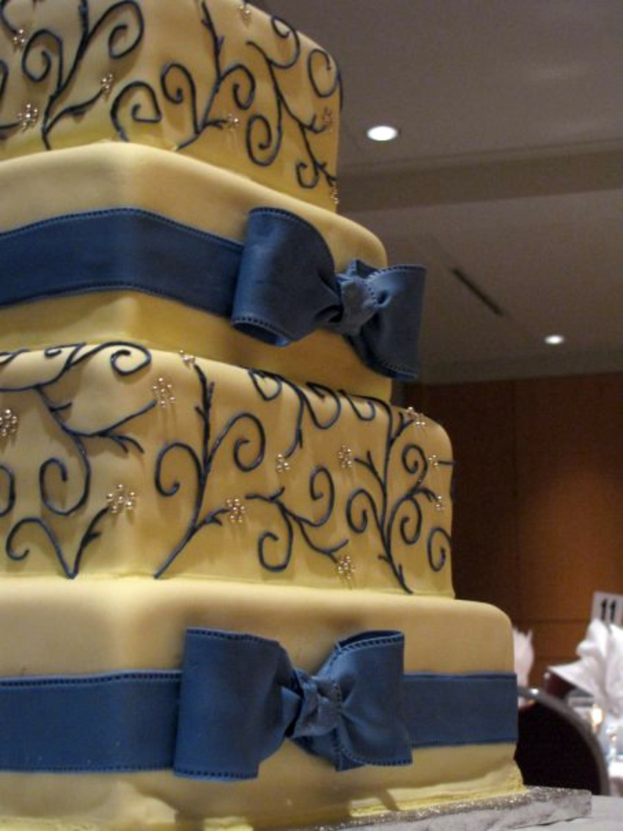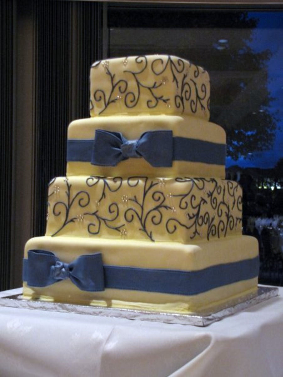 6", 8", 10", 12" Squares covered in MMF with fondant/gumpaste ribbon and bows. Piping in royal icing with silver dragees.