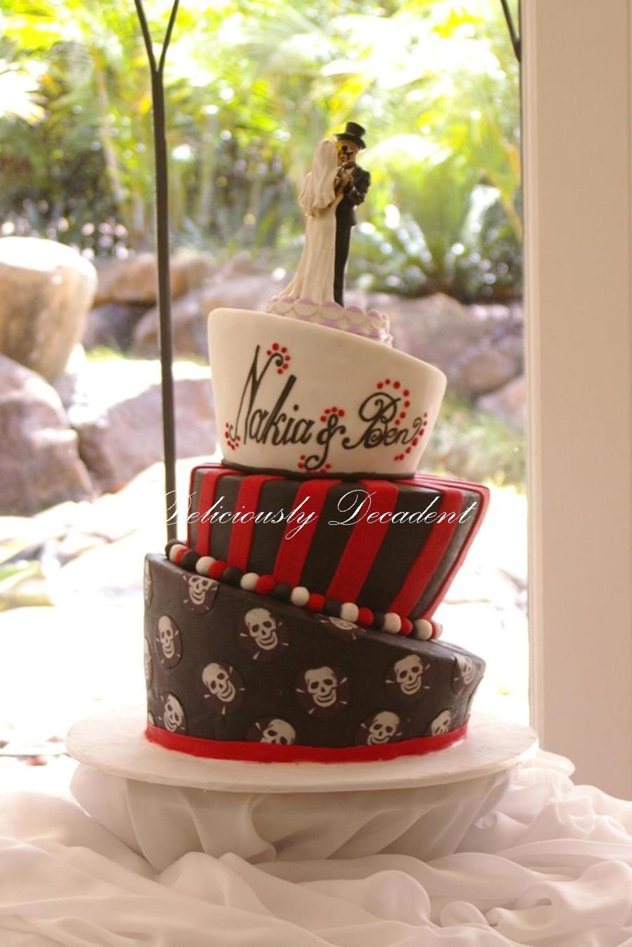 gothic wedding topsy turvey in 11"9"7" tiers in strawberry mud top tier is fondant with names drawn with edible marker middle tier all fondant base tier is fondant with edible images of skulls. the topper was a complete nightmare to attach it was really heavy, it is 2 skeletons, bride and groom, licking each others faces with the inscription love never dies, this was so fun!!!