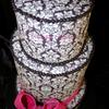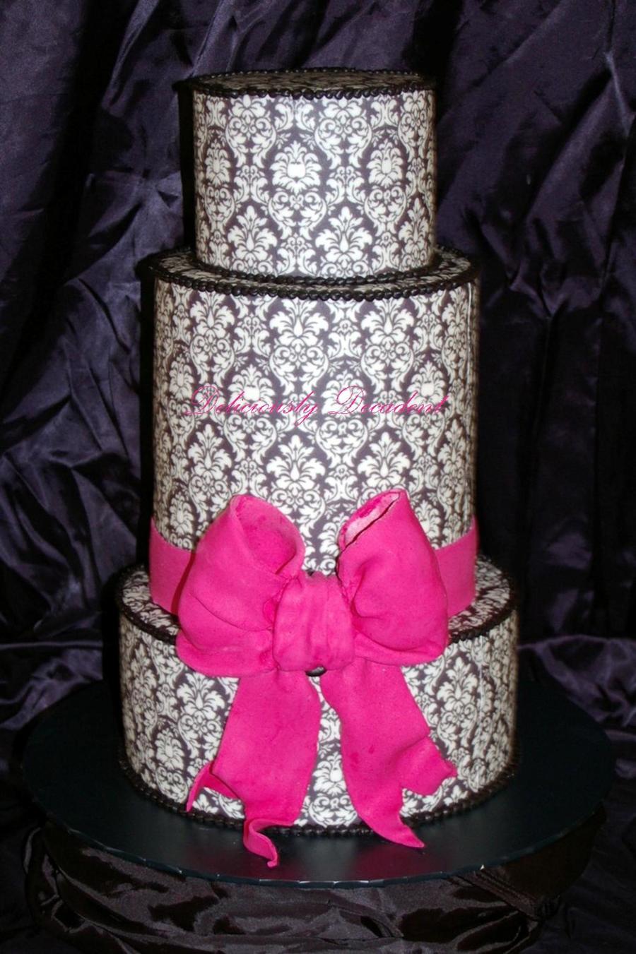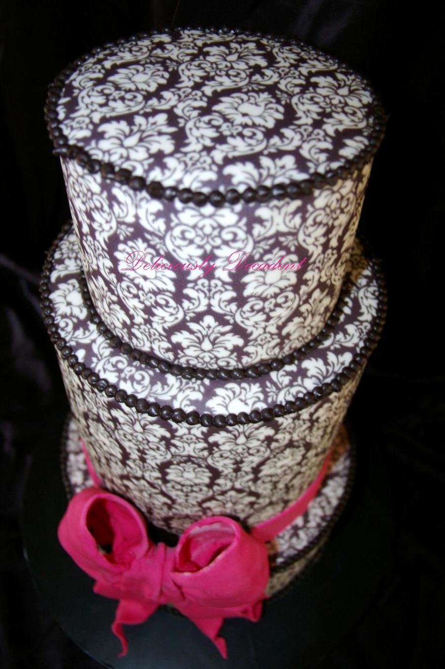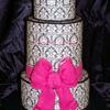 5" double barrell or 2x7" and a 9" one of my all time fave cakes to make!!! covered in fondant then i applied damask printed edible imaged and edged the tiers in black royal icing pearls, hot pink ribbon is fondant and the bow is gumpaste thanks for looking :-)